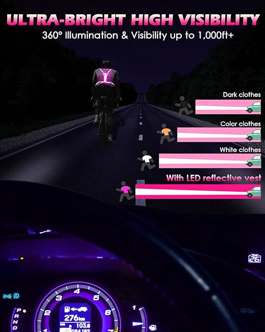 - Stay Safe, Stay Visible with High Visibility:This LED reflective vest uses top-tier LED lights and reflective strips, 360° lighting at night to ensure your safety, even in the harsh environment of 1000 feet away. And keeping you seen and safe during low-light outdoor activities with the reflective running vest.